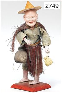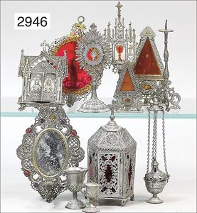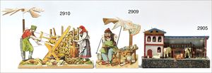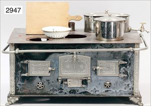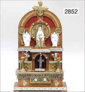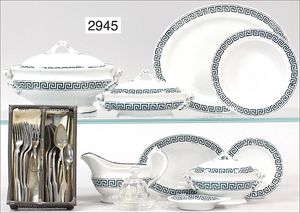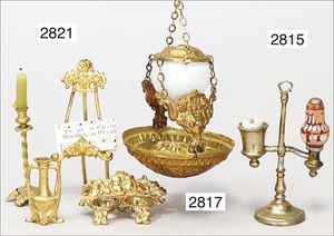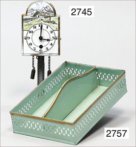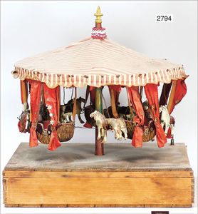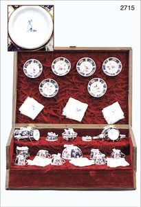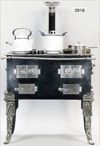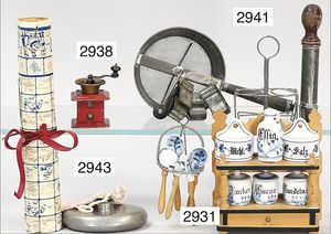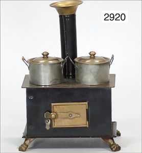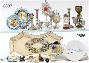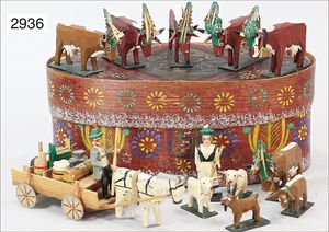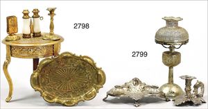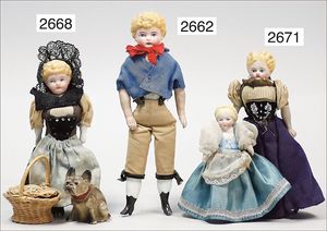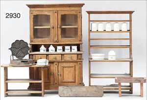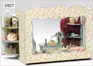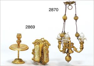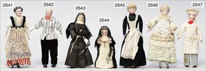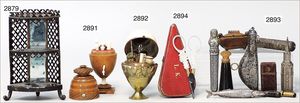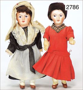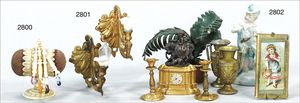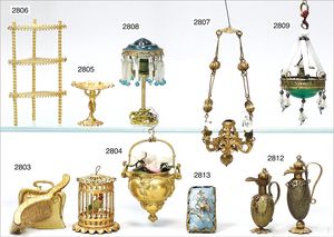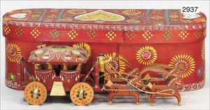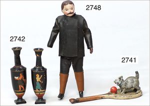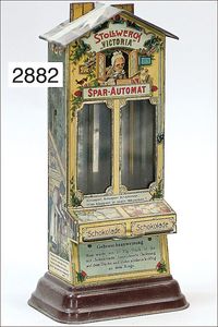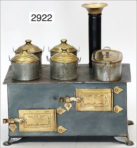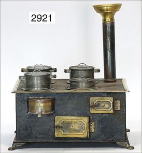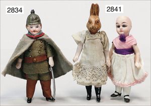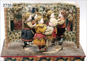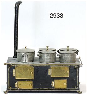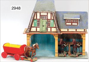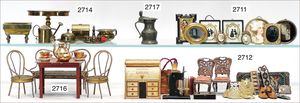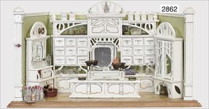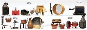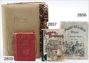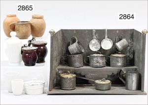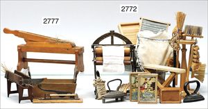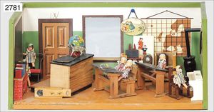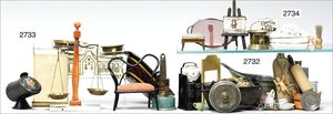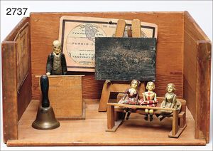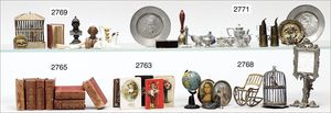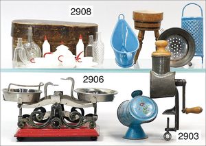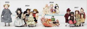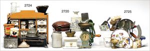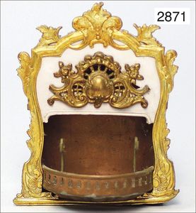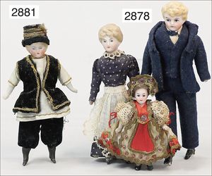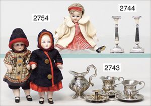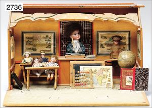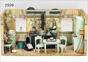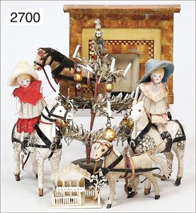 2-teilige Puppenstube, 1,11 m breit, 44 cm hoch, 45,5 cm tief, Orig.-Außenbemalung, alte Tapete an Wand und Boden, 3 Fenster, Vorhang, Verzierungen, Messingblech vergoldet, möbliert, mit herrschaftl. Gründerzeit-Möbeln, Spiegel, Schrank, Kommode mit Aufsatz, Höhe 27,5 cm, Sitzgruppe mit umbautem Sofa, hinten verspiegelt, dazu passend Schlafzimmer, reichh. Zubehörteile, Zinn, Blech, Porzellan, 1 Puppenstuben-Puppe