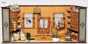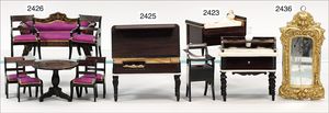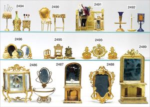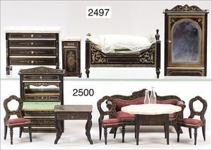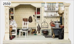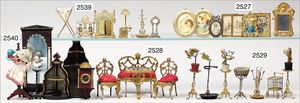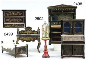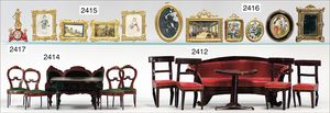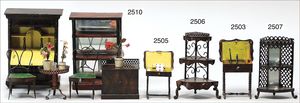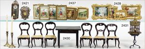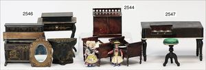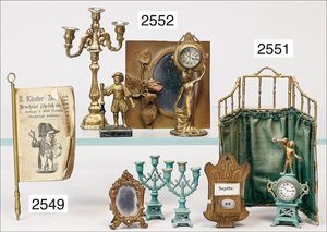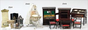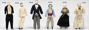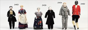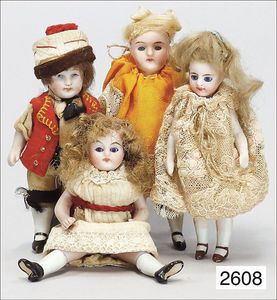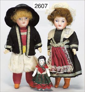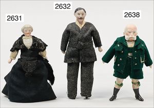 3 Teile Puppenstuben-Puppen, Biskuitporzellan-Brustblattkopf, 1 x Mann, leicht ausmodellierter Backenbart, gemalte Augen, Biskuit-Unterarme und -Beine, 14 cm, dazu Dame, leicht ausmodellierte blonde Haare, Biskuit-Unterarme und -Beine, Stoffkörper, 13 cm, dazu 1 Kind, Biskuit-Arme und -Beine, 9,5 cm, gemalte Augen