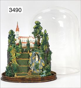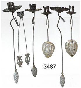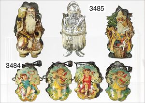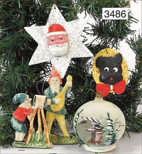 Konv. Christbaumschmuck, 2 Baumanhänger Zwerge, 6,5 cm und 10 cm, dazu Glaskugel mit Guckloch, flacher Boden, dazu 2 untersch. Oblaten mit Papiermaché-Gesichtern