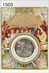 mathematical game, EUREKA, K. B. PARIS, pressed cardboard, multicolored lithographed, with metal hand, 22.5 cm by 30.5 cm