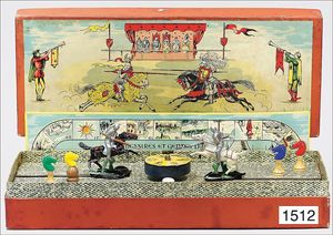 game, France, "Le Tournoi", probably from the '20s, board game, 2 tin riders on a horse with lance, mechanism with spring balancer, 50 cm long, 21 cm deep, unusual, with game guidance, original box, with multicolored lithographed cover picture, nice original condition