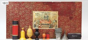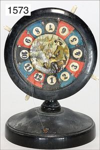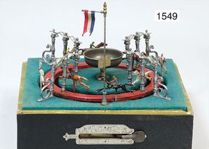 game, with 19 paper strip, 33 cm tall, 22 cm in diameter, paper strip colored by hand, c. 1870, is a museum piece