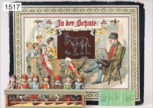game "In der Schule", German, around 1900, hinged figures, with question cards, with game guidance, original box with multicolored lithographed cover picture, 33.5 cm by 26 cm, box is a little bit worn at edge, otherwise nice original condition