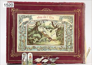 game, "Grand jeu de L´oie", France, board game, 4-parts, with 5 tin geese, game boards and 2 ivory- ices, with game guidance, lithographied on the board, in original box, with multicolored lithographed cover picture, around 1900