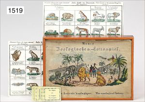 BIEDERMEIER, "Neues Zoologisches Lottospiel", 10 handcoloured plates, labeled in 3 languages, with small cards with writing, original wooden box, cover picture was colored by hand