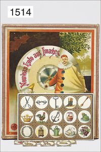 lottery putting game, France, "Nouveau loto aux Images", "De la collection des Editions Sala", "marque Cachet rouge", with game guidance, original box multicolored lithographed, as far as possible complete