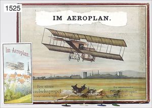 game, "In Aeroplan", 4-part board game, is torn at the crease, 5 flight machines, 1 is missing, 6 game bowls with stake and game guidance, original box, multicolored lithographed cover picture, 42 cm by 31.5 cm
