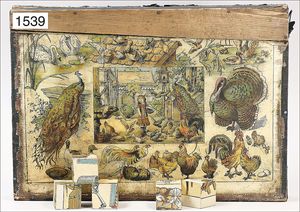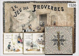 BIEDERMEIER, game, "Le Jeu des Proverbes", France, Watilliaux Editeur Paris, 18 plates, colored by hand, with ivory parts, original box with a cover picture that was colored by hand, rural scene, the worn condition is caused of old age, straps at the side of the cover picture are missing