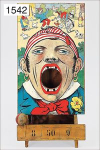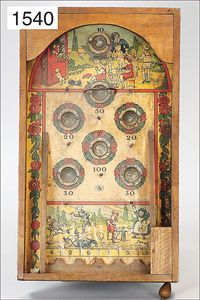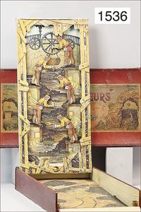 ball game, "Jeu des Mineurs", France, game can be folded out, with moving figures in a mine, wood/cardboard, stuck with lithographed paper, 65 cm tall, 61 cm deep, in original box, box with multicolored lithographed cover picture, unusual