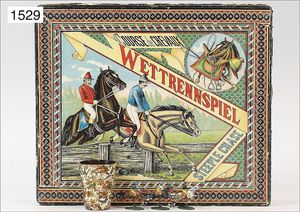 race game, "Course de Chevaux", with 6 tin jump jockeys, 8-part board game, cube, dice shaker, without game guidance, original box with lithographed cover picture, foot at one figure is missing, 1 figure with glued foot
