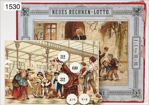 game, "Neues Rechenlotto", 1 x 1 to 10 by 10, 9 plates, in original box, adhesive tape at the side, multicolored lithographed cover picture, around 1900