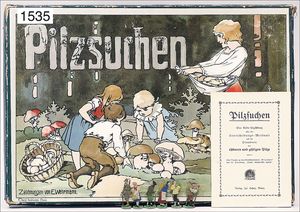 game, "Pilzsuchen", publishing house Josef. Scholz, Mainz, illustrations by E. Wehrmann, board game, 4-part, with 6 pewter figures, original guidance, c. 1915, original box, multicolored lithographed cover picture, box is at edge a little bit worn which is caused of old age