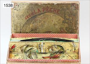 fishing game, France, JEU DE LA PÊCHE, lake shaped like a turning disk, bridge, clock mechanism drive, with music mechanism, with fishes, in original box, multicolored lithographed cover picture, box outside is a little bit worn, around 1900, rare, with game guidance