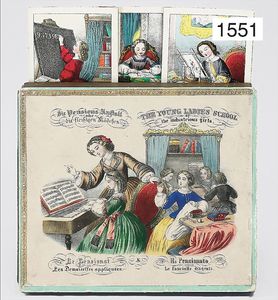card game, Biedermeier, colored by hand, in original box, "Die Pensionsanstalt", in German, English, French and Italian, cover is also colored by hand, 20 cm by 17 cm, without instructions