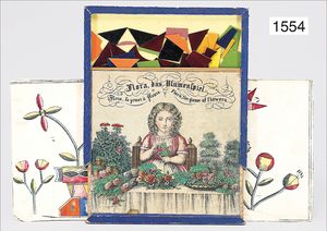 child's play, "Flora das Blumenspiel", in German, French and English, colored by hand, Biedermeier, putting game with different mosaic flowers, probably complete, in original wood box, 16 cm by 16 cm