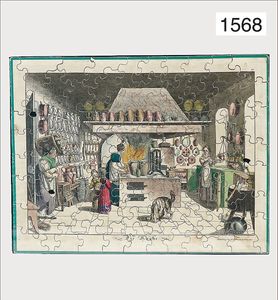 early puzzle, c. 1860, motif: the kitchen (kitchen with chimney hood), 30 cm by 23.5 cm, exceptional representations, 3 small patches with flaws, framed