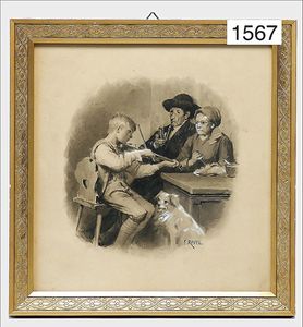 picture, painter E. RAVEL, watercolor, c. 1910, 25.5 cm by 26.5 cm, framed, motif: children with violin, dog and grandparents