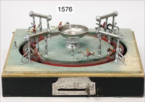 horserace game with spring drive, France, wooden box, 27 cm by 26.5 cm, casting, jockeys , good condition, around 1900
