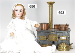 Puppenküche, Holz, Trapezförmig, Länge 1,16 m, Höhe 38 cm, Tiefe 54 cm, um 1910, mit reichh- Zubehör, Holzmobiliar, beige/blau bemalt, dazu 1 BING Herd, kompl., etwas Porzellan, 1 Blech-Brotdose, rund, einige Teile Steingut, Blecheimer mit Deckelaufschrif