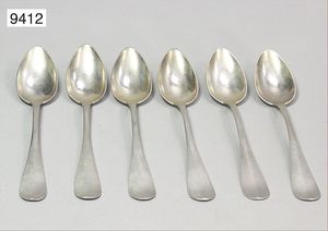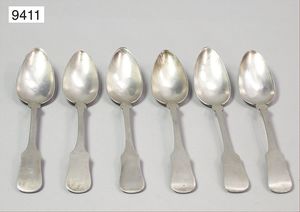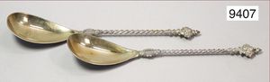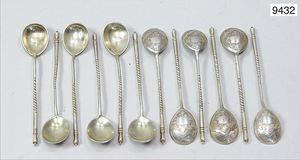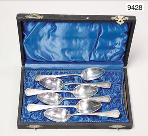 Sammlung alter englischer Kaffeelöffel aus Sterlingsilber mit Golfmotiven, insg. 29 Stück und eine Gabel, erste Hälfte 20 Jhdt., mit englischer Glasvitrine Mahaghoni