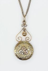 Damentaschenuhr , GG 585/000, als Anhänger umgearbeitet, Rückseite feine Gravur, Uhr läuft (reinigungsbedürftig)