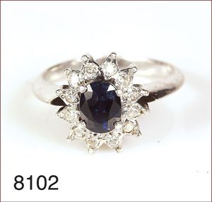 Silber Saphirring, fac. Saphir oval, ca. 0,82 ct, 12 weiße Steine, RW 50