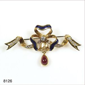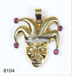 Origineller Harlekin Anhänger (Italien), GG 750/000, Brillant ca. 0.13 ct, weiß, 4 Rubine ca. 0,62 ct, gesamt ca. 18,4 g