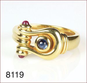 PIAGET Dreh-Ring, Brillant/Rubin/Saphir/Smaragd, Zertifikat , gesamt ca. 13,9 g, RW ca. 55