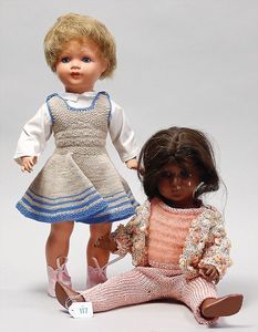 2 Puppen, 1x K&R 115A, Replica 1985, aus Vinyl, 38 cm, 1x Schildkröt Mambi, Replica, gemarkt 36