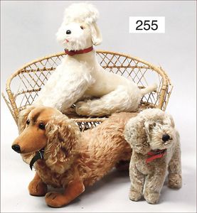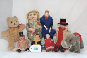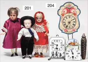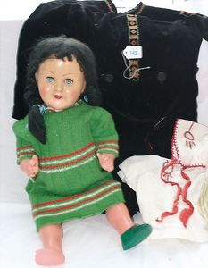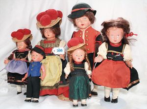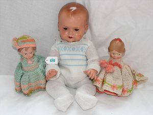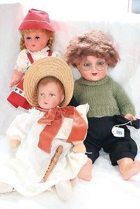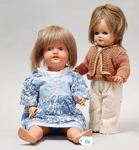 3 Puppen, 1x K&R, Celluloidkopf-Puppe, gem. 728/7, blaue Schlafaugen, Augenmechanismus hängt, off. Mund, 2 Zähne oben, Zunge, Kunsthaarperücke, auf Celluloid-Stehbabykörper, Stimme fehlt, 44 cm, 1 Kunststoff-Puppe, gem. Freiberg, 36 cm, blaue Schlafaugen, Kunsthaarperücke, mit Stimme, 35 cm, 1 Papiermaché-Einbindekopf-Puppe, gemalte Augen, modellierte Frisur, Stoffkörper, weich gestopft, 36 cm