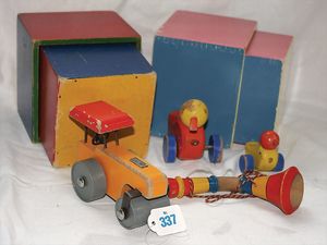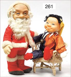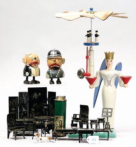 Fundkiste, 2 Lauffiguren, Holz, etwas wurmstichig, dazu einige Möbelteile für 1 Japan-Zimmer neuer, 1 Puppenstubenofen, Notenständer und kl. Porzellanhund, 1 Klingelengel, wohl Erzgebirge, Höhe ca. 27 cm
