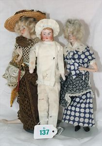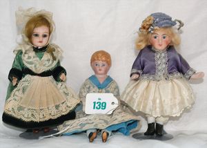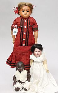3 Puppen, 1x Schildkröt-Brustblattkopf-Puppe, gemarkt S.o.R. 11 1/2, Augen fehlen, off. Mund, Zähne, Echthaarperücke aufgeklebt, Wachstuchkörper, Celluloidarme, Stoffunterschenkel, 45 cm, alte Kleidung und Wachstuchschuhe Gr. 3, 1x SFBJ Porzellankopf-Puppe, gemarkt Paris 11, braune fest eingesetzte Glasaugen, off. Mund, Zähne, Echthaarperücke aufgeklebt, auf einfachem Masse-Stehkörper, Beine lose, 30 cm, 1x Celluloid-Vollkopf-Baby, gemarkt Adler Francaise 20, gemalte Augen, 1 Wange u. Nase etwas verformt