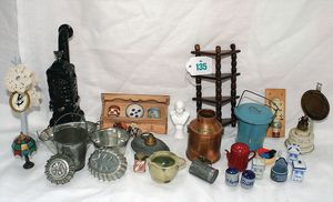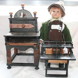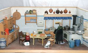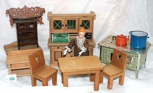 Puppenküche, neuer, L: 68 cm, T: 30 cm, H: 29 cm, mit altem Puppenherd, Blech, Spülbürstenhalter und Zwiebelkorb alt, einige Möbelteile neuer, Brotdose und Ölkanne, altersbed. Farbabplatzer, 2 Porzellan-Puppenstuben-Puppen und vieles mehr