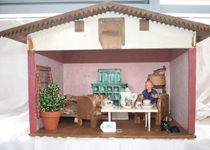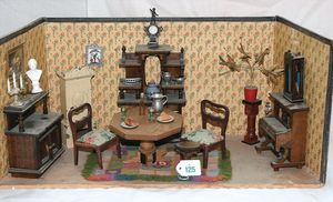 Puppenstube, L: 50 cm, T: 22 cm, H: 23 cm, mit Wohnzimmer-Möbelprogramm (Gründerzeit), Blechofen, versch. Kleinteile