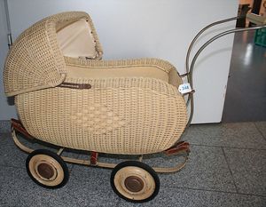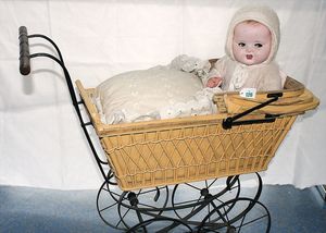 Korb-Puppenwagen, Gussspeichenräder, mit Wachstuchverdeck, Griffhöhe 62 cm, 1 K&R Celluloid-Kopf-Puppe, gem. 351/4, stark bespielt, Farbe ausgeblichen