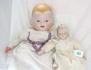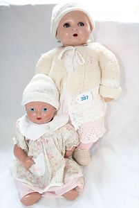 2 Kunststoff-Puppen, 1x Baby, Vollkopf, 60 cm, blaue fest eingesetzte Glasaugen mit Stimme, 1x modell. Frisur, Glasaugen, Farbabrieb an den Haaren u. im Gesicht, 37 cm