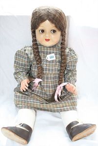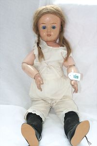 K & R Masse-Puppe, gem. 926, braune Schelmenaugen, off. Mund, 2 Zähne oben, Zunge, Kunsthaarperücke aufgeklebt, auf Masse-Stehbabykörper, Körper stellenw. überstrichen, 68 cm
