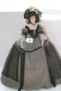 Kaffee-Wärmer, Masse Halbpuppe, Kopf seitl. geneigt, Farbabrieb auf der Nasenspitze, Echthaarperücke, Porzellanarme, 1 Daumen weggebrochen, 43 cm