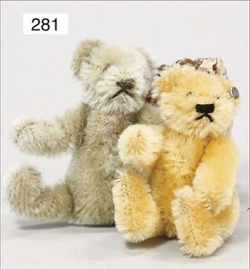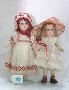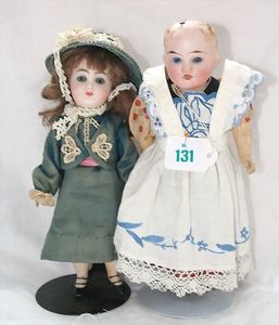2 Porzellankopf-Puppen, 1x gem. Germany 12, blaue fest eingesetzte Glasaugen, off. Mund, Zähne, Masse Stehkörper, 17 cm, 1x gem. 1000, blaue Schlafaugen, off. Mund, Zähne, Mohairperücke, auf Masse Stehkörper, mit anmodellierten Schuhen und Strümpfen, 20 cm