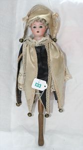 SCHÖNAU & HOFFMEISTER Porzellan-Brustblattkopf, blaue Glasaugen, off. Mund, Zähne, Mohairperücke, auf Holzstab, nachträglich befestigt, Kleidung nachgenäht, Gesamtlänge 32 cm