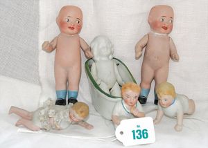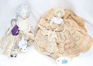 Konv. 4 Porzellan-Halbpuppen, einmal auf Nadelkissen, Höhe 12,5 cm, 1x mit angesetzten Beinen, Länge 10 cm, 1x 4,5 cm, 1x mit schön ausmodellierter Frisur, 1 Hand weggebrochen, liegt lose bei