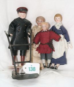 Konv. 6 Porzellan-Puppenstuben-Puppen, 2x Biedermeier, glasiertes Porzellan (Steifbeinpuppen), 7 und 12 cm, 2x mit Schottenhüten, 7 und 10 cm, Hersteller ?, 2x Puppen-Kaffee-Service, 1x im Orig.-Karton, Kaffeekanne 6,5 cm, 1x Kaffee-Service, Kaffeekanne 5,5 cm