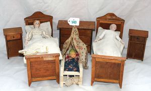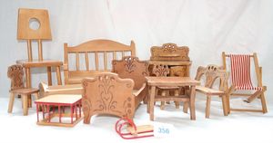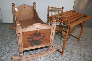 Konv. Puppenstubenmobiliar, Holz, Bett, Tisch, Bank, Komode, 2 Stühle mit Brandmalerei, Bettlänge 20 cm, dazu Bank, Stuhl, Sonnenliege, Wiege, Laufstall und kleiner Schlitten, alles neuer