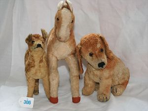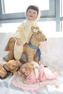 3 Künstlerpuppen, 2x ungem. auf Stoffkörper, 1x von Yolanda Bello, Vinylkopf, Stoffkörper, weich gestopft, Vinylarme und Unterschenkel, 62 cm, 1 Schaukelpferd auf Holzkufen, Strohkörper, Sitzhöhe 32 cm