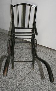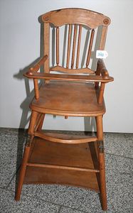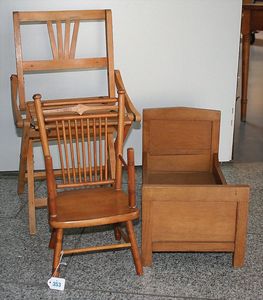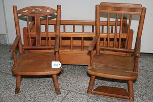 Konv. Puppenmöbel, 1 Gitterbett Holz, 50 cm, dazu 2 Stühle (Hochstühle), Unterteil fehlt, Sitzhöhe 10 cm