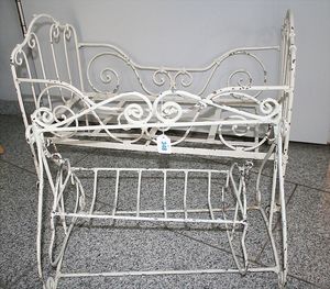 Konv. 2x Puppenbett, Metall lackiert, 1x Bett auf 4 Rollen, Länge 62 cm, Himmel fehlt, und 1x Wiege, Länge 44 cm, altersbedingte Farbabplatzer
