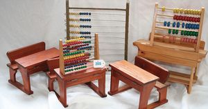 Konv. Puppenstubenmobiliar, Holz, 4 Schulbänke neuer, Sitzhöhe 7, 5 cm und 10 cm, dazu 3x Abacus