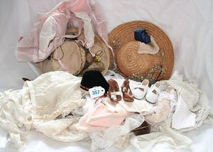 Konv. Puppenkleidung, Hüte, Hauben, einige Spitzenborden, 2 Paar Puppenschuhe alt, Leder Gr. 3 und Gr. 4