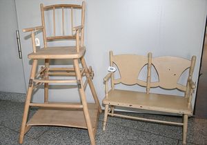 Puppenhochstuhl, Sitzhöhe 42 cm, umklappbar zum Spieltisch, dazu Puppenbank, Sitzhöhe 17 cm, Länge 39 cm