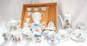 4x Kinder-Kaffee-Service, Porzellan, 1x im Orig.-Kart., Kaffeekanne, Höhe 11 cm, 6 Tassen, Untertassen, Milchkännchen und Zuckerschale, 3x Kinder-Kaffee-Service, Porzellan, mit Kinder- bzw. Blumenmotiven, nicht kompl.